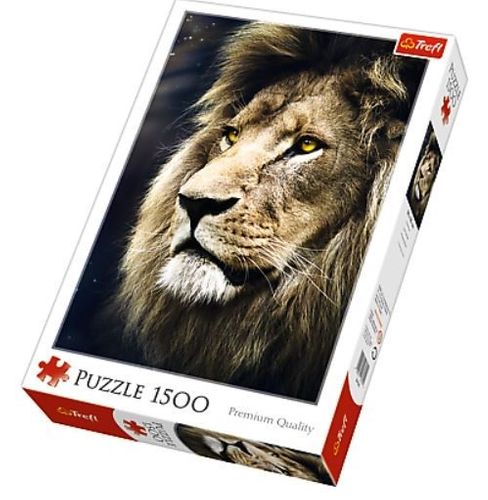 Puzzle 1500 elementów z portretem lwa. Po ułożeniu powstanie obrazek o wymiarach 85x58 cm. Wysoką jakość, nasycenie kolorów i bezpieczeństwo układania zapewnia kalandrowany papier odbijający światło, pokryty ekologicznymi farbami spożywczymi.