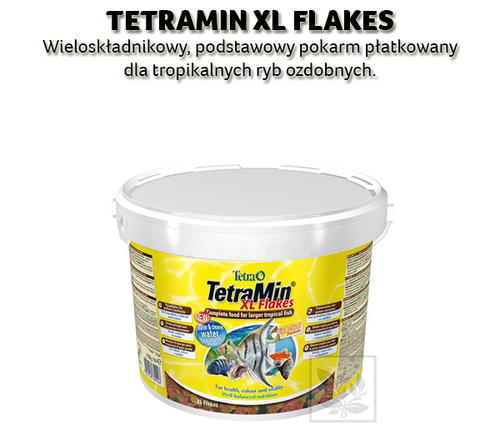 Tetra TetraMin XL Flakes to wieloskładnikowy, podstawowy pokarm płatkowany dla dużych, tropikalnych ryb ozdobnych, dla ich długiego i zdrowego życia. Stanowi kompletną i dobrze zbilansowaną mieszankę siedmiu różnych rodzajów płatków. Zawiera bardzo starannie wyselekcjonowane wartościowe substancje odżywcze, witaminy, minerały oraz pierwiastki śladowe, które gwarantują optymalne odżywianie dużych ryb ozdobnych. Wykorzystanie ponad 40 składników wysokiej jakości zapewnia doskonałą akceptację pokarmu przez rybki ozdobne. Opatentowana formuła BioActive zapewnia rybom zdrowie i energię. Duże płatki są dostosowane do rozmiaru otworów gębowych dużych gatunków ryb ozdobnych.
