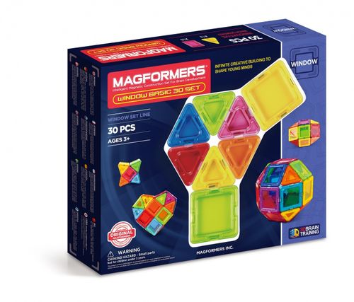 MAGFORMERS WINDOW BASIC 30 to klocki z wbudowanymi silnymi magnesami neodymowymi, które zawsze się przyciągają. Wystarczy zbliżyć do siebie ściankami dwa klocki, a one natychmiast ze sobą się połączą. Za pomocą klocków wzorowanych na kształt figur geometrycznych można zbudować wspaniałe trójwymiarowe budowle. W zabawie można korzystać z dołączonej do zestawu instrukcji lub innych przykładów zamieszczonych na stronie magformersworld.com lub własnej wyobraźni.