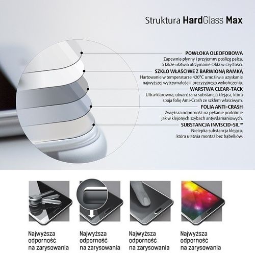 W HardGlass Max zastosowano krystaliczną strukturę szkła. Każda jej warstwa dobierana jest pod kątem klarowności tak, by zapewnić najwyższą jakość barw i ostrości, bez wpływu na oryginalnie wyświetlany obraz.