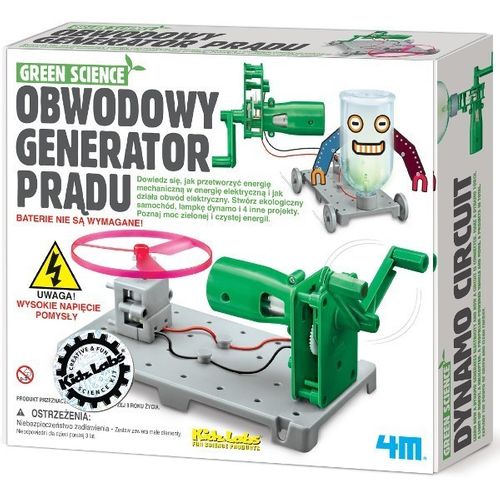 Dowiedz się, jak przetworzyć energię mechaniczną w energię elektryczną i jak działa obwód elektryczny. Stwórz ekologiczny samochód, latarkę i 4 inne, ekologiczne projekty. Jak to działa?Generator prądu zawiera zwoje drutu zamontowane na pręcie i magnesy na stałe umocowane wewnątrz obudowy. Kiedy kręcisz korbą zwoje się przekręcają, ale magnesy się nie poruszają. Czynność ta sprawia, że przez zwoje drutów przepływa elektryczność, a więc funkcją dynamo jest wytwarzanie prądu. Silnik zawiera te same elementy co prądnica, ale działają one w odwrotny sposób. Elektryczność przepływająca przez zwoje pomiędzy magnesami wytwarza siłę, która obraca zwoje. Dioda LED pozwala elektryczności przepływać tylko w jedną stronę. Dlatego kręcąc korbą w drugą stronę nie sprawisz, że dioda się zaświeci.ZAWARTOŚĆ:Części składowe silnika:obudowa silnika, silnik, czarny i czerwony przewód, koło pasowe silnika, 2 śruby.Części składowe generatora prądu:pokrywa i podstawa, zestaw elementów do złożenia obudowy rączki, zestaw do złożenia korby, silnik z przekładnią zębatą i przewodami,pokrywa przekładni zębatej, 3 koła zębate, śruba z podkładką, 8 śrub, 3 osie obrotowe.Komponenty dla poszczególnych projektów:płyta podstawy, śmigło, lampka LED z przewodem, 3 koła, koło pasowe, uchwyt na butelkę, złącznik przewodów, uchwyt śmigła, 2 zatyczki,opaska elastyczna.Potrzebne będą także, a nie są dołączone do zestawu: czysta plastikowa butelka po napoju, taśma lub sznurek, mały śrubokręt krzyżakowy.Wiekod 8 latWymiaryop. 24x22x6 cm