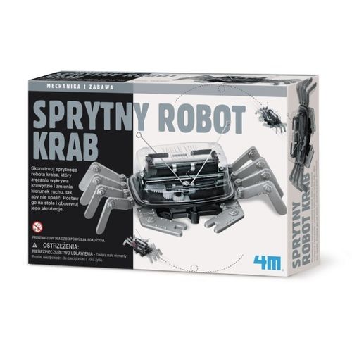Skonstruuj sprytnego robota kraba, który zręcznie wykrywa krawędzie i zmienia kierunek ruchu, tak aby nie spaść. Postaw go na stole i obserwuj jego akrobacje.Nogi robota są specjalnie zaprojektowane do pochłaniania wstrząsów. Jeśli robot przypadkowo spada ze stołu, nogi jako pierwsze dotkną ziemi. Nogi absorbują uderzenia i wstrząsy, chroniąc w ten sposób korpus przed uszkodzeniem. Jeśli siła oddziaływania jest duża, nogi mogą wypaść z obudowy. Nie martw się tym - zainstaluj je ponownie. Wiele robotów - krabów zostało zaprojektowanych w taki sam sposób jak prawdziwe skorupiaki - do chodzenia bokiem. Kraby chodzą bokiem, ponieważ nie potrafią chodzić do przodu! Stawy w ich nogach zginają się tylko w pozycji góra-dół, nie z boku na bok.Wiekod 8 latWymiaryop. 24x16,5x6