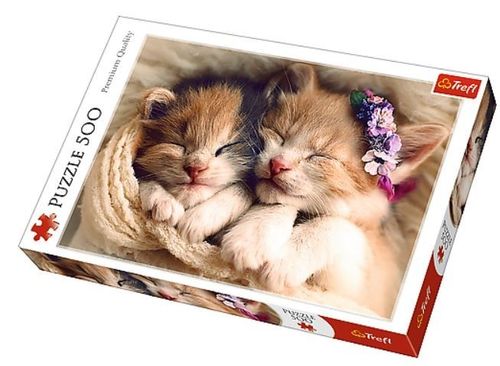Puzzle 500 elementów przedstawiające śpiące kotki. Po ułożeniu powstanie obrazek o wymiarach 48x34 cm. Wysoką jakość, nasycenie kolorów i bezpieczeństwo układania zapewnia kalandrowany papier odbijający światło, pokryty ekologicznymi farbami spożywczymi.
