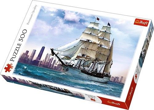 Puzzle 500 elementów z widokiem żaglowca na tle Chicago. Po ułożeniu powstanie obrazek o wymiarach 48 x 34 cm.