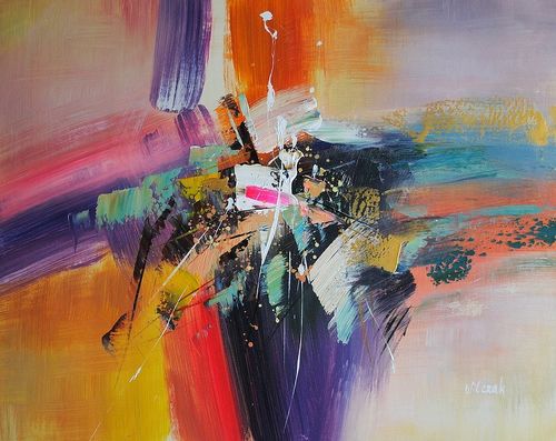 Ręcznie malowany obraz olejny na płótnie! Dostępny bez blejtramu. Sygnowany i werniksowany. Rozmiar - 50x60cm. Przedstawia współczesną abstrakcję o oryginalnym zestawieniu kolorystycznym oraz nowoczesnej stylistyce, wpływającej na wygląd estetyczny wnętrz mieszkalnych!
