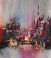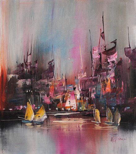 Oryginalny obraz abstrakcyjny z motywem marynistyki i weduty miejskiej! Kompozycja charakteryzująca się nowoczesną stylistyką. Obraz olejny idealny do dekoracji współczesnych wnętrz!