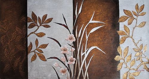 Piękna abstrakcja z kwiatami! Nowoczesny obraz olejny w stylu art-deco. Kolorystyka w odcieniach brązu i szarości, czyni z tego obrazu, idealną dekorację do większości współczesnych wnętrz!