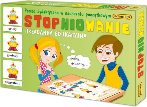 Układanka zawiera 48 rysunków, które ilustrują 16 zestawów przymiotników w stopniu równym, wyższym i najwyższym.