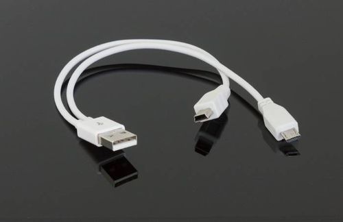 Kabel 2w1 przeznaczony do wszystkich urządzeń posiadających złącza microUSB i miniUSB.