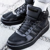 Inspirowane koszykówką. Buty z cholewką przypominającą skórę i tekstylną wyściółkę, która zapewni aktywnym stopom trwały komfort. Trzy paski i gumowa podeszwa nadają butom klasyczny, koszykarski styl. Dzięki wulkanizowanej gumowej podeszwie, buty mają zapewnioną dobrą przyczepność. Model adidas Hoops 2.0 Mid – B44649 w kolorystyce czarnej jest bardzo stonowany, ich styl jest jak najbardziej lifestyle’owy.