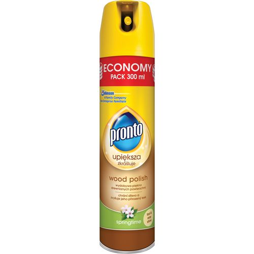 Aerozol przeciw kurzowi Pronto Springtime do mebli drewnianych. Skutecznie usuwa kurz, smugi i nadaje połysk.