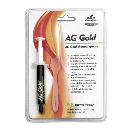 AG Gold to wysokiej jakości pasta termoprzewodząca. Dzięki 45% zawartości złota, jej przewodność cieplna jest 3 razy wyższa, niż w przypadku normalnych past termoprzewodzących. Pozwala to na obniżenie temperatury procesora o około 6 stopni, nawet bez zmiany radiatora. Pasta stanowi najlepszą alternatywę dla overclockerów.