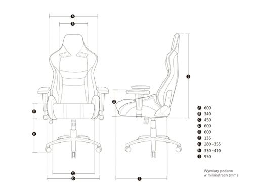| Informacje dodatkowe | Rodzaj pianki: Pianka do formowania kształtów o wysokiej gęstości Gęstość pianki: 55 kg / m³ (siedzisko) 50 kg / m³ (tył) Regulowane podłokietniki: Wysokość, obrót, do przodu i do tyłu |