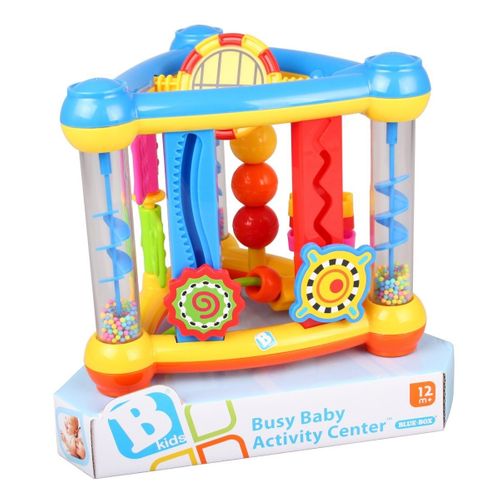 Aktywne centrum zabawy w kształcie trójkąta z wieloma elementami: różne kształty, koraliki, pokrętła. Nadaje się do zabawy zarówno w domu jak i na zewnątrz. Trójkątny kształt zabawki pozwala na swobodne zabranie jej ze sobą i przenoszenie.
