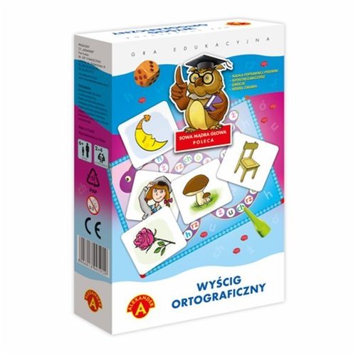 W grze "Wyścig ortograficzny" wygrywa ten, kto najszybciej odnajdzie, wśród tabliczek leżących na stole, obrazek zawierający w nazwie literę z pola, na którym zatrzymał się pionek. W trakcie zabawy dzieci poznają i utrwalają sobie właściwą pisownię wyrazów z "rz", " ż", "ch", "h", "ó" i "u". Gra jest również świetnym treningiem spostrzegawczości i refleksu dla młodszych i starszych graczy.Wiekod 7 latWymiaryop. 18x11,5x3,5 cm
