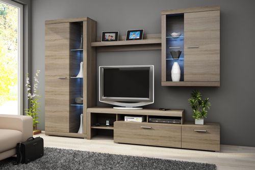 KOLORYSTYKA:Korpus: DĄB TRUFLOWY lub SONOMA CIEMNAFront: DĄB TRUFLOWY lub SONOMA CIEMNA WYMIARY: (szer / wys / gł)Meblościanka (280/197/32-45)WYKONANIE:Płyta wiórowa laminowanaOkleina ABSListwa z płyty MDFOświetlenie LED (opcja)PRZEWIDYWANY CZAS REALIZACJI: 7 – 21 DNI Meble w paczkach do samodzielnego montażu wraz z instrukcją i akcesoriami.