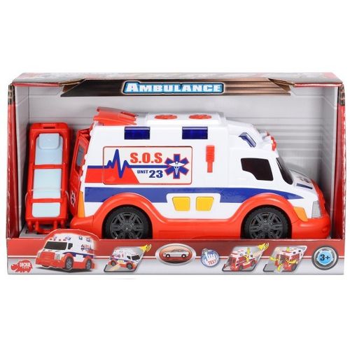 Nowy biało-czerwony Ambulans wyposażony w otwieraną klapę bagażnika oraz nosze. Pojazd posiada funkcję światła i dźwięku oraz Try me. Samochód ma dłudość 33 cm.