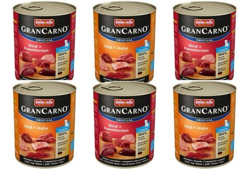 15x ANIMONDA GranCarno Junior smak: Wołowina + kurczak 800g 15x ANIMONDA GranCarno Junior smak: Wołowina + serca indyka 800g Animonda Grancarno Junior Wołowina i kurczak jest to pełnoporcjowa karma mokra z wołowiną i kurczakiem dla szczeniąt. Animonda GranCarno dla psów została specjalnie stworzona z najwyżej jakości świeżych mięs. Karma bogata jest w ważne i łatwo przyswajalne składniki odżywcze. GranCarno nie zawiera zbóż, soi, żadnych sztucznych barwników lub konserwantów, ani GMO. Zaletami karmy mokrej Animoda GranCarno Junior z Wołowiną i kurczakiem są: Kompletna karma mokra dla szczeniąt wszystkich ras. Prawdziwy, czysty smak wołowiny i kurczaka, za którym przepada Twój pies. Bez sztucznych wzmacniaczy smaku. Dodatek minerałów i witamin dla wsparcia zdrowia. W puszce znajdują się tylko te składniki, które ujęte są na etykiecie. Skład: 40% wołowiny (mięso, wątroba, płuca, serca, nerki, wymiona), 28% kurczaka (mięso, wątroba, żołądek, szyja), węglan wapnia, olej z łososia (0,2%). Analiza: Białko 11%, tłuszcz 8%, włókno surowe 0,5%, popiół surowy 2%, wilgotność 77%. Dodatki: Witamina D3: 200j.m./kg, Witamina E2: 0.2 mg/kg, Witamina E5: 1.5 mg/kg Witamina E6: 10 mg/kg. Dawkowanie: Dzienna porcja w gramach: Waga psa (kg) 2/3 miesiące 4 miesiące 5/6 miesięcy > 6 miesięcy 0,45-1,4 kg 85-160 g 125-160 g 160 g 190 g 1,5-2,6 kg 235-275 g 240 g 230-335 g 260 g 3-7 kg 540 g 350-415 g 485-560 g 380-640 g Animonda Grancarno Junior Wołowina i serca indycze jest to pełnoporcjowa karma mokra z wołowiną i sercami indyczymi dla szczeniąt. Animonda GranCarno dla psów została specjalnie stworzona z najwyżej jakości świeżych mięs. Karma bogata jest w ważne i łatwo przyswajalne składniki odżywcze. GranCarno nie zawiera zbóż, soi, żadnych sztucznych barwników lub konserwantów, ani GMO. Zaletami karmy mokrej Animoda GranCarno Junior z Wołowiną i sercami indyczymi są: Kompletna karma mokra dla szczeniąt wszystkich ras. Prawdziwy, czysty smak wołowiny i serc indyczych, za którym przepada Twój pies. Bez sztucznych wzmacniaczy smaku. Dodatek minerałów i witamin dla wsparcia zdrowia. W puszce znajdują się tylko te składniki, które ujęte są na etykiecie. Skład: 54% wołowiny (mięso, wątroba, płuca, serca, nerki, wymiona), 14% serca indyka, węglan wapnia, olej z łososia (0,2%). Analiza: Białko 11%, tłuszcz 8%, włókno surowe 0,5%, popiół surowy 2%, wilgotność 77%. Dodatki: Witamina D3: 200j.m./kg, Witamina E2: 0.2 mg/kg, Witamina E5: 1.5 mg/kg Witamina E6: 10 mg/kg. Dawkowanie: Dzienna porcja w gramach: Waga psa (kg) 2/3 miesiące 4 miesiące 5/6 miesięcy >6 miesięcy 4,5-7,5 kg 725-1200 g 800 g - - 8-10 kg 1400-1475 g 1200-1340 g 765 g 900 g 12,5-17,5 kg - 1700-1770 g 560-1800 g 1300-1500 g 18-25 kg - - 1675-1800 g 1600-2000 g Dzienna porcja karmy powinna być dostosowana do aktualnej kondycji psa, aktywności, stanu zdrowia i temperatury otoczenia. Pies powinien mieć zawsze dostęp do świeżej wody.