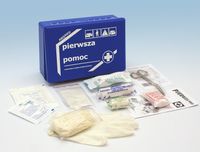 Apteczka Samochodowa AS2 Wyposażenie opatrunek osobisty (1szt.), opaska dz. 4x5 (1szt.), opaska dz. 4x10 (1szt.) plaster 6x10 (1szt.), plaster MINIFOL (2szt.), kompres 5x5 (1 op.), kompres 7x7 (1 op.) rękawice medyczne (4szt.), nożyczki (1szt.), ustnik do sztucznego oddychania, instrukcja pierwszej pomocy wymiary pudełko 260 x 170 x 80 mm Cena dotyczy 1 sztuki apteczki Czas realizacji zamówienia do 7 dni
