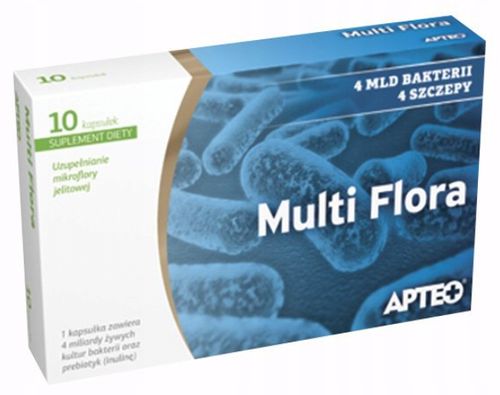 Preparat Multi Flora APTEO to aż 4 mld żywych kultur bakterii w postaci 4 specjalnie wyselekcjonowanych szczepów. Zawiera inulinę o właściwościach prebiotycznych. Nie wymaga przechowywania w lodówce. Składniki suplementu uzupełniają mikroflorę bakteryjną przewodu pokarmowego, utrzymują równowagę mikrobiologiczną podczas i po antybiotykoterapii, wspomagają funkcjonowanie bariery jelitowej, wspomagają naturalną odporność organizmu.