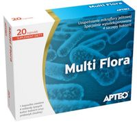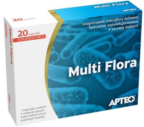 Preparat Multi Flora APTEO to aż 4 mld żywych kultur bakterii w postaci 4 specjalnie wyselekcjonowanych szczepów. Zawiera inulinę o właściwościach prebiotycznych. Nie wymaga przechowywania w lodówce. Składniki suplementu uzupełniają mikroflorę bakteryjną przewodu pokarmowego, utrzymują równowagę mikrobiologiczną podczas i po antybiotykoterapii, wspomagają funkcjonowanie bariery jelitowej, wspomagają naturalną odporność organizmu.