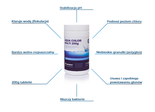 Aqua Chlor Multi 200 g - chlor wolno rozpuszczalny w postaci tabletek 200 gramowych. Chlor posiada działanie wielofunkcyjne, które zostało opisane powyżej. Dozując 1 tabletkę 200 g na 20 m3 wody podtrzymasz właściwy poziom chloru. Tabletki należy umieścić w skimmerze lub pływającym dozowniku, ponieważ wrzucone bezpośrednio mogą odbarwić dno basenu. Preparat rozpuszcza się około 5-9 dni w zależności od temperatury wody i poziomu chloru w basenie. Preparat służy do tzw. stałej dezynfekcji czyli podtrzymania prawidłowego stężenia chloru, przed użyciem Aqua Chlor Multi 200g powinieneś przeprowadzić dezynfekcje szokową preparatem Aqua Szok GR 60.