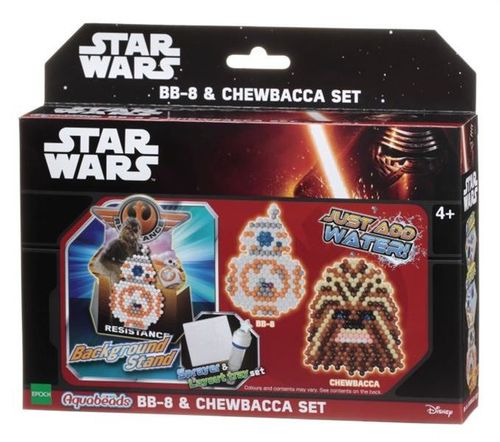 Jesteś prawdziwym fanem „Star Wars”? Dzięki temu zestawowi Aquabeads, możesz utworzyć dwie z najsłynniejszych postaci tej sagi. Korzystając z ponad 500 koralików w 10 kolorach i spryskiwacza, możesz stworzyć własnego BB-8 i Chewbaccę. W zestawie znajdziesz fantastyczną podstawkę z tłem, na której możesz postawić swoje dzieła.