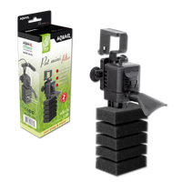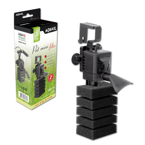 AQUAEL PAT MINI – miniaturowy filtr turbinowy PAT MINI przeznaczony do małych akwariów słodkowodnych. Urządzenie to składa się z maleńkiej głowicy oraz starannie selekcjonowanej gąbki filtracyjnej. Dzięki zastosowaniu innowacyjnych rozwiązań konstrukcyjnych głowica ta posiada wydajność maksymalną aż 400 l/h, czyli tyle, ile typowy średniej wielkości turbinowy filtr akwariowy. A wszystko to przy poborze energii nie większym niż 4 W. W rezultacie PAT MINI zapewnia wydajną filtrację nawet w 120-litrowym zbiorniku. Czy jednak nie zrobi nadmiernej „pralki” w dużo mniejszym akwarium? Nie ma obaw, bowiem na przedniej części głowicy znajduje się przełącznik sterujący wydajnością pozwalający na dostosowanie tego parametru do potrzeb każdego akwarysty. Filtr posiada również końcówkę kierunkową, która umożliwia ograniczenie prądu wody w akwarium poprzez jego skierowanie np. na ściankę zbiornika. Został wyposażony także w rurkę napowietrzającą podłączaną do dyszy wylotowej, co pozwala na skuteczne i wydajne natlenianie wody w zbiorniku.