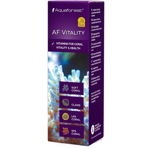 Ciągły dostęp zwierząt żyjących w akwarium do witamin poprawia ich kondycję oraz odporność. AF Vitality zawiera: witaminę A, witaminę B1, witaminę B2, witaminę B6, witaminę B12, witaminę C, witaminę D3, witaminę E, witaminę K3. Produkt przeznaczony wyłącznie do akwarystyki. Przechowywać w chłodnym miejscu z dala od światła oraz dzieci.