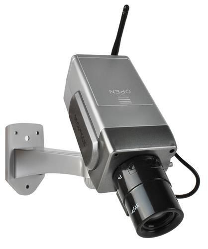 Dokładna imitacja kamery posiada wszystkie elementy, które upodabniają ją do prawdziwego urządzenia. Migająca dioda przyciąga uwagę i sprawia wrażenie, że sprzęt jest stale aktywny oraz połączony z systemem monitoringu. Imitacja zmiennoogniskowego obiektywu połączona jest z korpusem za pomocą kabla, a realistycznego wyglądu dopełnia znajdująca się na tyle obudowy antena. Urządzenie wyposażone jest w czujnik ruchu, który aktywuje mechanizm poruszający poziomym ustawieniem kamery w zakresie ok. 45°. W momencie jego uruchomienia, atrapa kamery skanuje czterokrotnie przestrzeń znajdującą się przed nią. W zestawie znajduje się także naklejka CCTV. Czarne litery na żółtym, dobrze widocznym tle, informują, że w obiekcie bądź na terenie nieruchomości działa system monitoringu. Może to dodatkowo wpłynąć na ewentualne zniechęcenie potencjalnych przestępców do podjęcia zabronionych prawem działań.