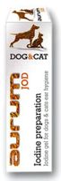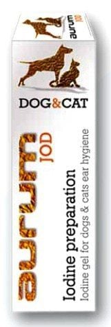 Skład Mieszanka jodu i swoistych oksyetylenowych związków powierzchniowo czynnych, glikolu propylenowego, w neutralnym, niedrażniącym, specyficznym dla uszu podłożu, o silnych właściwościach czyszczących i odtłuszczających oraz soli sodowej sulfobursztynianu dioktylu i laurylosiarczanu sodu. Przeznaczenie i sposób stosowania Preparat przeznaczony jest do zakraplania kanału słuchowego, po myciu preparatem Aurum–0 i płukaniu preparatami Aurum–2, lub 3, lub 4, uszu psów i kotów. Preparat działa poprzez zawartość jodu. Należy delikatnie wypełnić całkowicie kanał słuchowy roztworem i rozmasować. Nadmiar wytrzeć. Czynność powtarzać co 8-12 godzin przez 7 dni. Przed użyciem wstrząsnąć. Przed użyciem należy skonsultować się z lekarzem weterynarii. Uwaga Nie stosować u zwierząt uczulonych na jod