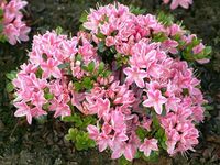 Karłowy krzew o zwartym pokroju, osiągający w wieku 10 lat około 60 cm wysokości i 90 cm szerokości. Liście drobne, ciemnozielone i błyszczące, nie opadają na zimę. Kwiaty dwubarwne, w kolorze różowym z białym marginesem na brzegu. Zebrane w efektowne kwiatostany na szczytach pędów. Kwitnie bardzo obficie w maju i czerwcu.