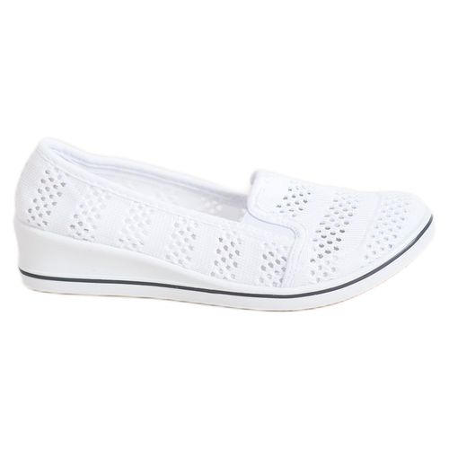 Eleganckie damskie baleriny o charakterze sportowym. Cholewka wykonana jest z białego materiału tekstylnego. Dekoracją, którą na sobie mają buty, jest ażurowy wzór ułożony w poziome szerokie paski. Odpowiedni profil fasonu oraz gumowe kliny ułatwiają ich zakładanie. Balerinki mają niewysoką platformę z czarnym cienki paskiem.
