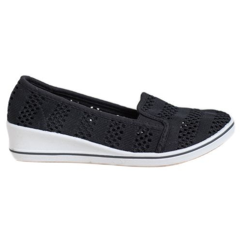 Sportowe baleriny idealne na co dzień. Buty powstały z ażurowej tkaniny w kolorze czarnym. Obuwie wsuwa się na stopę, co jest łatwiejsze dzięki klinom na przegubie. Dla kontrastu baleriny mają białą platformę z wysokim koturnem. Dolną część stanowi wygodna i bezpieczna bieżnikowana podeszwa wykonana z gumy.