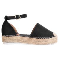 Damskie espadryle SHELOVET to buty z wycięciami po bokach cholewki, która z przodu posiada dodatkowo ażurowy wzór. Obuwie to posiada czarny kolor, dzięki czemu jest ono uniwersalne i praktyczne. Plecione, 4-centymetrowe platformy nadają butom urok i wakacyjny wygląd. Z kolei zapięcie na sprzączkę ułatwia ich regulację.