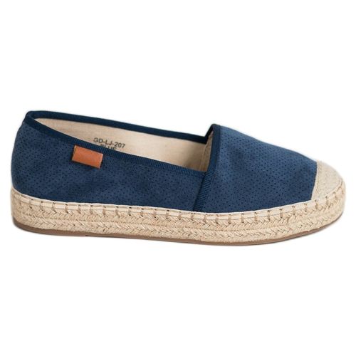 Ażurowe espadryle damskie w granatowym kolorze wykonane z zamszowej skóry ekologicznej. Podeszwa ozdobiona jest plecionką ze sznurka, co jest typowe dla tego rodzaju obuwia. Buty są niesamowicie wygodne a ich wygląd ponadczasowy. Espadryle pasują do niemal każdej stylizacji casualowej, a ich uniwersalny kolor pasuje do wielu zestawień kolorystycznych.