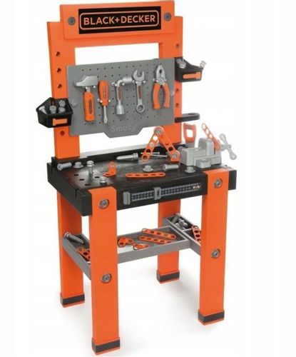 Realistyczny stół warsztatowy z półkami, miejscem na wbijanie gwoździ, z 79 akcesoriami, w tym śrubokręty, motek, piła, kombinerki, imadło i inne.