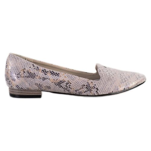 Modne, a przy tym bardzo eleganckie baleriny damskie wyprodukowane z skóry ekologicznej. Zwierzęcy wzór na cholewce sprawia, że ten model obuwia świetnie wpisuje się w aktualne trendy w modzie. Noski w kształcie migdałów optycznie wysmuklą kobieca sylwetkę. Buty będą pasować do zrónicowanych stylizacji.