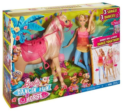 Inspirowani filmem „Barbie i siostry: Na tropie piesków” Barbie i jej tańczący koń bawią się na 3 sposoby: konik zatańczy sam, ale chętnie zatańczą też razem, gdy Barbie siedzi w siodle lub stoi obok.