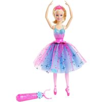 Wirująca Baletnica Barbie jest gotowa kręcić klasyczne piruety. Prosty mechanizm jest łatwy w obsłudze. Wystarczy przyczepić różowy uchwyt z rączką do talii lalki i wcisnąć w dół lalka Barbie wykonuje klasyczne pli i robi uroczy piruet! Spódnica wykonana jest z dwóch warstw tkanin niebieskiego aksamitnego spodu oraz różowego tiulowego wierzchu z niebieskimi błyszczącymi się motywami. Gorset mieniący się odcieniami błękitu i różu oraz różowe baletki są dopełnieniem tego stroju. W zestawie lalka w ubrankach (niezdejmowanych), diadem i uchwyt uruchamiający piruety. Kolory i elementy dekoracyjne mogą się różnić.
