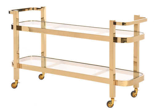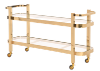 Dwupoziomowy barek Monumental ze złotym wykończeniem. Rama barku wykonana z nierdzewnej stali w złotym kolorze osadzona jest na czterech mikro kółkach, co znacznie ułatwia przesuwanie barku. Blat składa się z dwóch poziomych blatów z transparentnego szkła. Szerokość barku wynosi 46cm, długość 140cm, a wysokość całej konstrukcji 78cm. Barek Monumental doda wnętrzu ponadczasowości i finezyjnej elegancji.