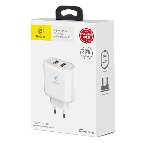 Baseus Bojure to kompaktowa ładowarka sieciowa z wtyczką typu C (tzw. europejską) oraz 2 portami USB umożliwiającymi odnawianie energii 2 urządzeń jednocześnie.