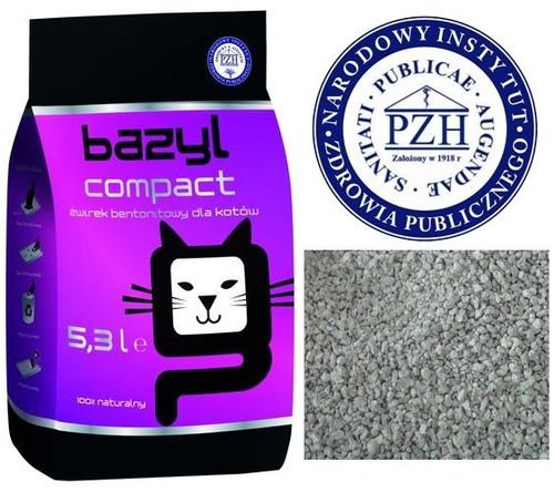 BAZYL Compact 10L Ag+ Bazyl Compact to naturalny, higieniczny żwirek bentonitowy o doskona��ych właściwościach zbrylających oraz wyjątkowych walorach wizualnych i użytkowych.Wolny od pyłu, bardzo wydajny i ekonomiczny - wystarczy wsypać do kuwety 1,5cm. Bazyl Compact absorbuje wilogć i neutralizuje charakterystyczną nieprzyjemną woń. Pochłania o około 10-15% więcej wilgoci, niż najlepsze żwirki bentonitowe na rynku. Wysokochłonny, biodegradowalny .Posiada Atest PZH "Bazyl" proponuje największe 5,3 l opakowania żwirków bentonitowych na polskim rynku, w 5 wariantach: Compact, Lavender, Pine, Sea i Universal. Bazyl Ag+ jest to aseptyczny żwirek, dzięki któremu kocia kuweta będzie wolna od bakterii i przykrego zapachu. Nano srebro zamknięte w strukturze bentonitu działa permanentnie i całkowicie zapobiega rozwojowi bakterii i grzybów. Nano srebro będące naturalnym antybiotykiem, ma właściwości aseptyczne i dezynfekujące. Żwirki bentonitowe Bazyl Ag+ są zupełnie bezpieczne nawet dla małych dzieci i co równie ważne, przyjazne dla alergików! ultrahigieniczna ściółka z dobroczynnym nano srebrem całkowicie usuwa przykry zapach z kuwety innowacyjna jakość na rynku