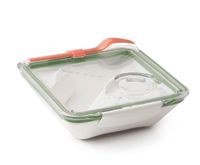 W zestawie: duży pojemnik, mały pojemnik, pojemniczek na sos, pokrywa z wgłębieniem na np. dip, widelec z krawędzią do krojenia