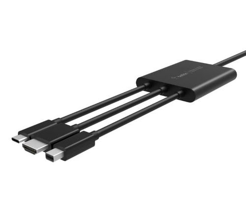 Natychmiast podłącz laptopa do projektora HDMI lub wyświetlacza. To najlepsze rozwiązanie z jednym kablem zawiera trzy popularne typy złączy: Mini DisplayPort, USB-C TM i HDMI, eliminując potrzebę stosowania wielu kabli, które mogą spowolnić połączenie, oraz bałaganu w salach konferencyjnych i przestrzeniach roboczych.