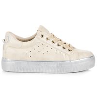 Stylowe, beżowe trampki damskie na wysokiej platformie 3 cm w kolorze srebrnym. Buty niesamowicie się prezentują na stopie i stanowią fantastyczny dodatek do wielu codziennych ubiorów. Wykonane są z tworzywa skóropodobnego. Obuwie posiada urocze zdobienie na zapiętce w postaci wyszywanej kokardki z perełką.