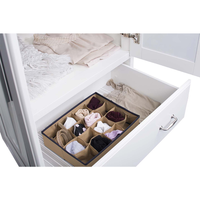 Organizer do szuflady z szesnastoma przegródkami. Wykonany z „oddychającej” TKANINY, przepuszczającej powietrze i łatwej do czyszczenia. Ścianki boczne usztywnione tekturą, po obu stronach obszyte tkaniną. Górna i dolna krawędź dodatkowo wzmocnione taśmą, zabezpieczającą przed uszkodzeniem. Można go wstawić do szuflady lub postawić w szafie na półce. Idealny do przechowywania drobnych rzeczy, takich jak paski, krawaty czy bielizna.