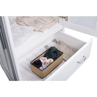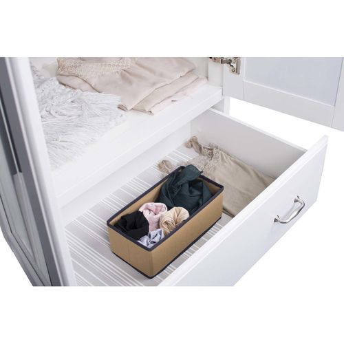 Niezwykle praktyczny organizer. Wykonany z TKANINY, przepuszczającej powietrze i łatwej do czyszczenia. Ścianki boczne usztywnione tekturą, po obu stronach obszyte tkaniną. Górna i dolna krawędź dodatkowo wzmocnione taśmą, zabezpieczającą przed uszkodzeniem. Wyjmowane za uchwyt denko, również jest usztywnione tekturą obszytą tkaniną oraz krawędzie dodatkowo są wzmocnione taśmą. Można go postawić w szafie na półce, lub wstawić do szuflady w komodzie. Idealny do przechowywania drobnych rzeczy, takich jak paski, biżuteria czy bielizna.