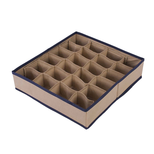 Organizer do szuflady z przegródkami. Wykonany z „oddychającej” TKANINY, przepuszczającej powietrze i łatwej do czyszczenia. Ścianki boczne usztywnione tekturą, po obu stronach obszyte tkaniną. Górna i dolna krawędź dodatkowo wzmocnione taśmą, zabezpieczającą przed uszkodzeniem. Można go wstawić do szuflady lub postawić w szafie na półce. Idealny do przechowywania drobnych rzeczy, takich jak paski, krawaty czy bielizna.