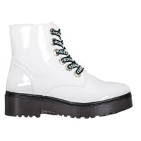 Sięgające za kostkę damskie buty z ociepleniem. Cholewka wykonana jest z lakierowanego tworzywa skóropodobnego w kolorze białym. Dla kontrastu na grzbiecie umieszczone są czarne sznurowadła z białymi napisami. Na dole znajduje się 2,5-centymetrowa platforma oraz niewysoki obcas. Spód butów wykonany jest z syntetycznego tworzywa z bieżnikiem.